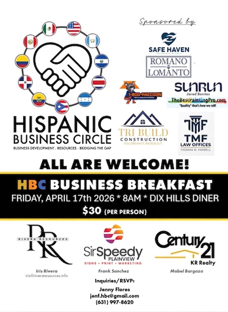 516Ads/ 631Ads are proud to team up with the Hispanic Business Circle and event sponsors Safe Haven Insurance, Romano LoManto PLLC, TMF Law Offices, Tri Build Construction, TheBestPaintingPro / Handyman Services, Jared Berrios | Sunrun & our friends @ 1-800-Raccoon Pest & Wildlife Control for our HBC Business Breakfast @ The Dix Hills Diner. We’re honored to work with Jenny Flores, Mabel Barzaga – Century 21, Iris Rivera – Rivera Resources and Frank Sánchez – Sir Speedy/ Plainview on this program/ initiative. $30 pp. Please RSVP. Hope to see you there!